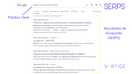 Hemos estado hablando de SERPS, pero: ¿Cuáles son las SERPS? Este término reúne las siglas de “Search Engine Results Pages”; es simplemente el acrónimo de “páginas de resultados de búsqueda”. Son los resultados de la búsqueda de las palabras clave que has puesto en la barra exploradora de Google.