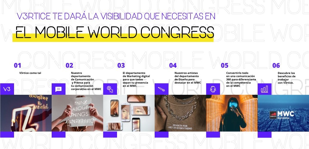 Como agencia de comunicación, en V3rtice nos encargaremos de que toda la comunicación que llevemos a cabo se englobe en una comunicación 360, donde el cliente o su producto será llevado por todas las fases de la publicidad y de una campaña. De esta manera conseguiremos que tenga una buena notoriedad en el Mobile World Congress, destacando sobre los demás al obtener un mayor conocimiento por los medios de comunicación y su público objetivo.