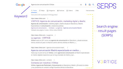 On the other hand, you will also see organic results by natural positioning, using SEO, as reflected in the following image: results for the keyword "V3rtice communication agency":