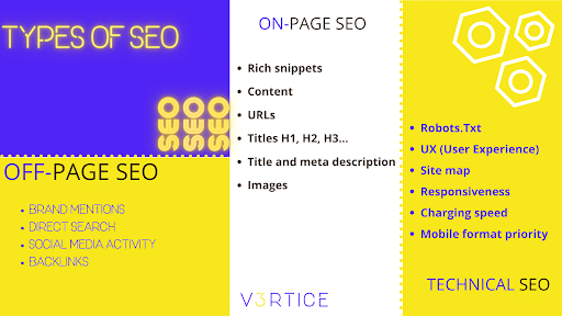 The types of optimization or parts of SEO are: On-page SEO (in the content), Off-page SEO (external resources) and technical SEO (technical part of the site):