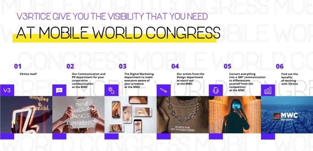 As a communication agency, at V3rtice we will ensure that all the communication we carry out is encompassed in a 360º communication, where the client or their product will be taken through all the phases of advertising and a campaign. In this way, we will achieve a high profile at the Mobile World Congress, standing out from the rest by gaining greater awareness among the media and your target audience.